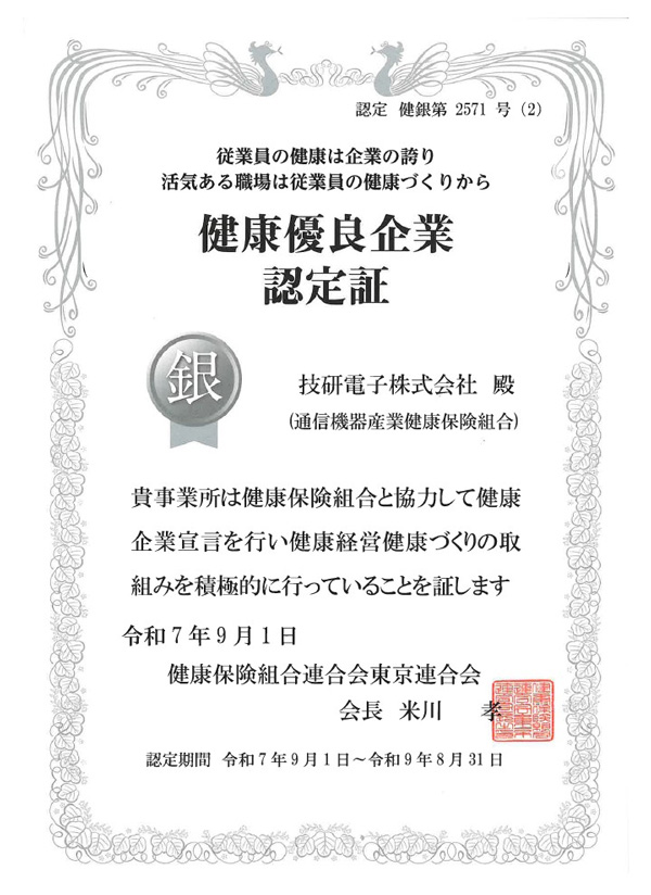 健康企業宣言を行い健康経営・健康づくりの取り組みを積極的に行っている企業として、令和5年8月8日付けで健康優良企業に認定され「銀の認定」を取得いたしました。